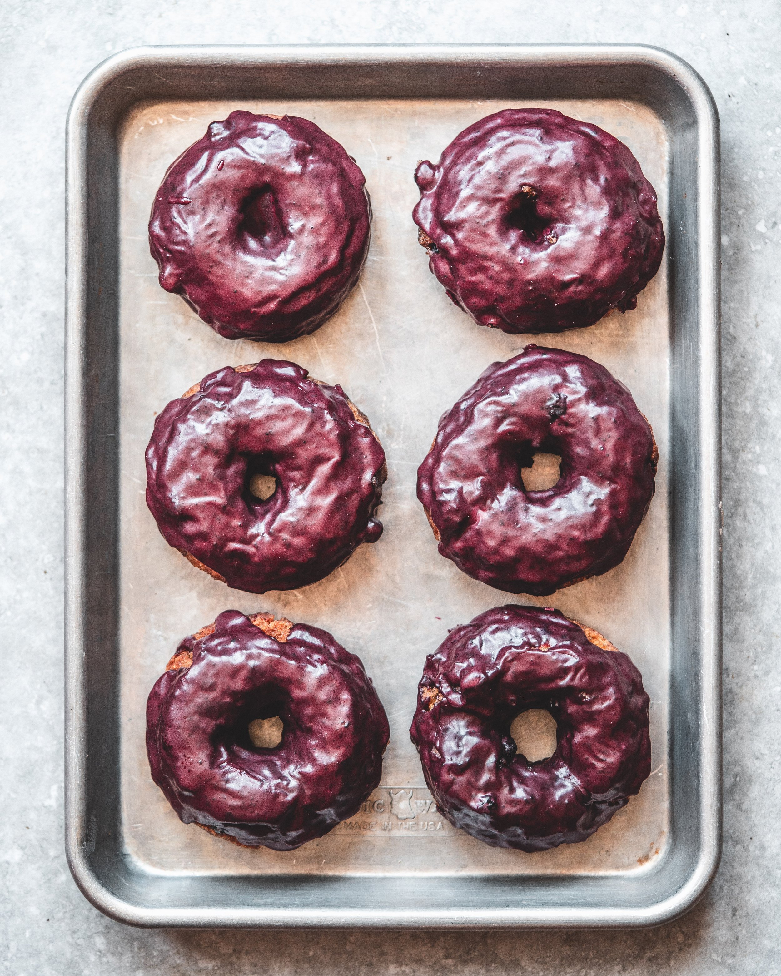 The inspiration for these doughnuts is from Blue Star Doughnuts who make a doughnut with a blueberry basil and bourbon glaze. I took that idea and ran with it, not only does the glaze have blueberries in (paired beautifully with basil and bourbon) the doughnuts themselves are studded with them too. A quick note on blueberries, for this recipe I like to use frozen blueberries as it helps to prevent them turning to mush when mixed into the batter. I also like to use frozen wild blueberries. Wild blueberries have a better flavour and importantly they are very small. The benefit of small berries is that they don’t affect the structural integrity of the doughnuts when cut and fried. I have made them with regular frozen blueberries and they work fine, they just tend to look a little more irregular in shape.